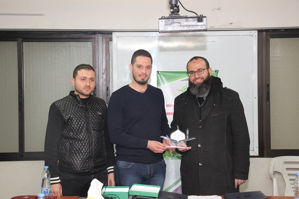 هذا وقد قدم الأستاذ محمد رمضان مسؤول الموارد المالية والعلاقات العامة في الجمعية درعا تكريميا للدكتور أبو ثريا عربون شكر ومحبة ووفاء على جهوده في في خدمة القرآن وأهله.